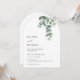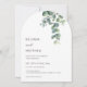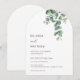 Denna eleganta minimalistiska moderna välvda bröllopsinbjudan har akvarellmålade eukalyptusblad på en vit bakgrund.