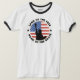 Fira dig direkt i Amerika, landet av det fritt som är hem- av indiankrigaren, med denna t-skjorta som presenterar en silhouette av frihetsgudinnan med US-flagga i bakgrunden.