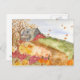 Ett vykort med ett säsong-tema med ett höstlandskap med en tyst land-hytt, fallande löv, mogna pumpor och färgstarkt landskap. Ett bra vykort till användan som ett flytta meddelande för att ge vänner, familj och kunder information om din nya plats.