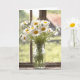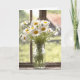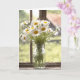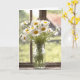 Vit daisy bouquet i det gamla träfönstret med gårdslingvistik för födelsedag. Text kan redigeras.