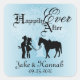 Ett par med hästsilhuetdesign, "lyckligt efter" med pars namn och datum med svart text och design över blå bakgrund.