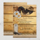 En romantisk efterbröllopsfest inbjudan med två hästar på en träpanel med hästskor, spetsar och en cowboy stövel. Perfekt för enbart mottagning eller efterbröllopsfirande med västerntema eller för hästälskare.