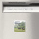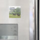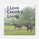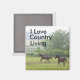 Fotografi av Standard Horses som går genom ett bete eller fält på en mistmorgon, med ord "I Kärlek Land Living", tryckt på en magnet.