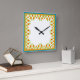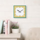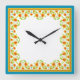 En söt Square Wall Clock, med en gräns av Pot Marigold-blommor på vit bakgrund. Del av insamlingen "Marigold Medley" av Posh & Painterly.