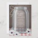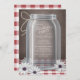 Inbjudningar: Rustic och vackert födelsedagsfest inbjudan i södra land, med ett exempel på en Mason burk med tråd som är bundet kring nacke, vita och lila daisy som ligger vid burk, en vit och röd gingham dam, över en bord brun bakgrund. Dina uppgifter om firande finns i burk, till vilket om texten sträcker sig in i skuggan av burk också kommer texten att skuggas (rekommenderas för behålla linjer kort).