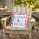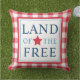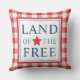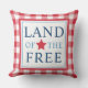 En patriotisk utomhuskudde med Land of the Free i fet blå text med en röd stjärnaaccent, infattad av en blå kant på en röd och vit ginghamrutig bakgrund. Den klassiska amerikanska designen är perfekt för fjärde juli, minnesdagen eller året runt patriotisk veranda styling.