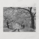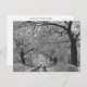 Ett svart och vitt foto av en väg genom ett landsbygdslandskap som är täckt av snö i Cheshire i England.