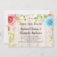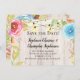 Spara datumkorten för ett kommande bröllop. Söt rosa och blåfärgade blommor och löv med strängar av ljus, ljus och mjölk perfekt för en utomhussommar bröllop med ett westernt land-tema.