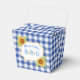 Blå gingham med gult solblommor och daisy. Perfekt för Baby Q-babyduschbarbeque eller ändra texten för något annat tillfälle.
