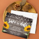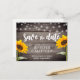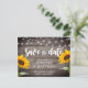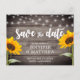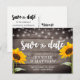 Vacker design bröllop rädda datum postkort med trä, ljus och solrosor.
