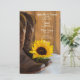 Låt gästerna på er lantgård stil, på ert lantgårdsområde, på temat möhippa eller på giftermål-mottagningen veta vad de kommer att äta med den charmerande Land solrosmeny Westerna Bröllop. Anpassa den med sallad eller första kurs, inträde eller andra kurs och dessert eller tredje kurs. Den här avslappnaden, som ändå har en anpassningsbar i rustik chic bröllop-menyn, har ett färgfoto av en gult blommar av solrosblomma, bruna cowboyskor av läder och avvanda laduvirke. Inspektion i perfekt för en informell händelse i party firande.