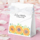 Sunblommor ger glädje! Den här charmerande bröllopsfavoritboxen är dekorerad med en originaldesign av solblommor och löv. Anpassa den med namnen och speciella dag. Ursprunglig vattenfärg © Michele Davies.