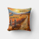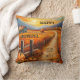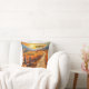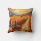 En färgstark konstnärlig kudde med ett höstlandskap i land med en gård och pumpor vid solnedgången. Underbart för att skapa Thanksgiving och varmt välkomna stil genom fall.