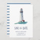 Elegantens kust sparar datumkorten med en vattenfärgad illustration av ett fyr i marinens, rött och vitt på ett tårhav, atop "save the date" och dina bröllop-detaljer i marinens blå text.