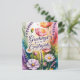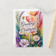 En livfull och glädjefull vertikal digital illustration utformad som ett botaniskt vykort. Kompositionen visar en excentrisk blandning av vilda blommor, inklusive vita och lavendelblommiga cosmosblommor, höga kvistar av lila lavendel och varma rosa och orange vallmo. Centrerad i mitten är frasen "Hälsningar från landsbygden" skriven med en elegant, djup lila kursiv stil med utsmyckade svep. Bakgrunden är en mästarelik stänk av akvarellpenseldrag i teal, magenta och gult, som skapar en ljus och luftig pastoral atmosfär.