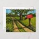 Min lilla oljemålning av en blankröd landsbygdspostlåda med ett vitt kuvert som tittar ut genom det öppna locket.