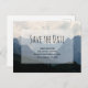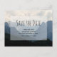 Spara datumet bröllop-vykortet med ett foto av vackra berg, grumligt himlar och rullande backe fyllt med träd i förgrunden. Grått Blue färg.
