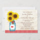 Solblommor i en mason burk på en fågelbarkbakgrund är stjärnorna för detta roliga landsbyggsbröllop inbjudningssvit. Röda gingham inslag lägger till en extra dos av återtagandekarm.