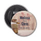 Flaska öppnar med ett land-tema som är ett orustiskt tema. En gammal rostig mjölk kan med en söt orange blomma vid sidan. Vetet och rödvallor i bakgrunden mot en svag träpanel. Anpassa med bröllop-parets namn och bröllop-datum.