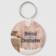 Kommemorativ nyckelkedja i bröllop med ett rostiskt land-tema. Ett gammalt rostigt mjölk kan med vete och rödpoppor i bakgrunden ställas mot en svag träpanel. Anpassa med bröllop-parets namn och bröllop-datum.
