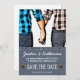 Perfekt för land, söder eller jordbrukaren och kvinnan, denna söta svarta och vita med rött och blått plaid, förutom datumet för den kommande inbjudan till bröllop, innehåller en söt, färsk, efterslimmad bild av ett fet land-par som håller händer. De är båda i avslappnad och bär kanske jordbrukskläder, i blå jeans och plaida arbetsskjortor. Fet, dramatiskt vit text på blå jean denim mönster-bakgrund med stygga accenter och nitar. Anpassa inbjudan med din egen personlig bröllop-datum och namn-information. Originalfotobilden var offentlig domän från kozzi.com Denim-accenter från DigitalScrapbooking.net