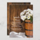 Ställa in en informell elegant-stämning för ceremonin och mottagningen i ranch stil lada giftermål med charming Wooden Bucket and White Daisys Landsbyggsbröllop Spara datum meddelande. Den här anpassningsbarna för rustik chic western lantgårdskaraktär med datumkortet har ett digitalt färgfoto av en trähink fylld med blommar av vit daisy och en vävfågelburk av barrträ. Inspektion av perfekt för en avslappnad av party firande-händelsen i ladugården.