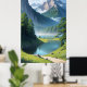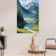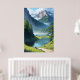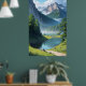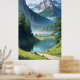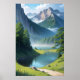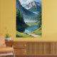 Bilden skildrar ett serenbergslandskap med en vattendrag som rinner genom en lush-dal. Floden, en vibrerande blå, återspeglar de omgivande bergen och himmel. De stora bergen som är stiga upp i bakgrunden, deras toppar som delvis döljs av kloka moln. Förgrundsinformationen har en grå väg som leder mot floden, med utspridd sten och vilda blommor som ett komplement till naturskönheten.