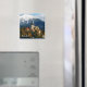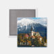 Fotomagnet från Souvenir på den lilla ön med kyrkan omgiven av träd på höst färger i Sjö Bled med i bakgrunden snö på topparna av Julian-Alpernorna i Slovenien på hösten med följande beteckning: "Bled".