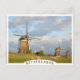 Fotovykort med tre vindkraftverk och får tittar in i kameran under vackra moln i himlar i ett vackert landskap i vår på landsbygden i Nederländerna med ett vitt kant och texten "Nederländerna".