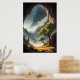 Bild skildrar ett typiskt landskap med en flodvåg som är belägen bland de torra bergen. Scenen ses inifrån en grotta, med den inledande ramen för det stora landskapet. Bergarna presenteras i grått-bruna nyanser, med häftiga moln som klamrar sig fast vid toppar. Två träd med pulserande grönt löv står i förgrunden, deras grenar närmar sig himmel.