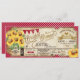 Röd ginghamruta med solrosbukett i murskål inslagen med säckväv och spetskant och en tvistsnursbåge rustik landskaps picknick bröllopsinbjudan.