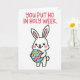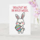 Det här kortet visar en enkel digital illustration av en vit, långörad kaninliknande figur 🐰 som står upprätt mot en enfärgad vit bakgrund. Den har små svarta prickögon, runda rosiga kinder och en öppen leende mun med en liten tunga som sticker ut, vilket ger den ett sött och vänligt uttryck som känns som att det är ämnat för någon nära. Figuren håller ägget i en mjuk omfamning, som om den kramar en liten present till en vän eller någon den älskar. Ägget är dekorerat med flödande, vågiga band i pastellblå, mjuk rosa och solig gul färg, vilket ger en vårkänsla 🌷. Nära toppen sitter ett kort meddelande ovanför figuren i rundade bubbelbrevsbokstäver, färgat i stark rosa. Texten är centrerad och utspridd så att det känns som att den talar direkt till kaninen nedanför