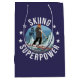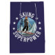 Rolig vintersportillustration med bergsgrafik och en kvinna på skidor, och texten: längdskidåkning är min superkraft och små stjärnor. Det här är den perfekta presenten för alla som älskar skidåkning, berg och vintersporter.