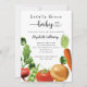 Kortet för inbjudan till babydusch på marknaden för juteodlare med illustrationer av grönsaker, inklusive brysselskott, morot, lök, tomat, söta ärter, slag. Texten längst upp säger "lokalt odlat baby"! Genusneutral utformning.