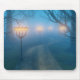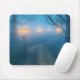 Fyra ljusreflexlampor på fyra lamposter skiner genom tät dimma och tänder en väg genom skuggorna och de blå banorna på träd under vintern.