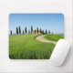 Mousepad med en curvy väg till och med kornet kantjusterar in mot en lantgårdvilla med en ro av cypressträd framme av den nära Pienza i den Val d'Orciadalen i Tuscany, italien.