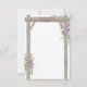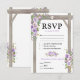 Eleganta svarskort för bröllop med en klass chic vit bakgrund som kan ändras till valfri färg, en stilren lila och lavendel vattenfärg blomsterdisplay på en rustik trädgårdsportal, ett skuret hjärta med parets initialer och en enkel mall för svar med menyalternativ.