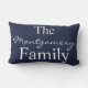 Pudra blått och den midnatta marinblåa hued dekorativ kudde med ord "välkomnande till vår stuga" i vit och ett mönster för bomullsblommaillustration. Baken presenterar din familj namn skrivar in.
