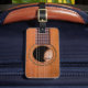 Specificera gitarrfotoet av stränger och låter hål på en sliten akustisk gitarr.