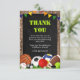 Dessa födelsedags tack-kort är en game changer! Roliga färgglada sport-tema, med en rustik trä och svart krittavla-bakgrund, dekorerad med små vita stjärnor, en regnbågsbanner, grönt gräs och en mängd sportutrustning (fotboll, volleyboll, basketboll, hockeypuck, rugbyboll, tennisboll, snookerboll, golfboll och till och med en pingisboll!). Den moderna tack-mallen är lätt att anpassa. För att ändra textens färg, typsnitt eller storlek klickar du bara på "anpassa ytterligare".