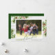 Detta lantliga julkort har en horisontell bild på en vit träbakgrund med vacker akvarell julgransgrenar och röda bär. Greetingsen "God Jul" visas i ljust grönt och mörkt grönt. Baksidan är mörkgrön med ett ljust grönt prickmönster. Anpassa detta kort med ditt familjenamn och år. Foto © Storytree Studios, Stanford, CA