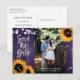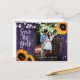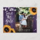 Lantliga blomsterbröllop spara datum fotovykort med solrosor och strängljus på en gammal träbakgrund. Perfekt kortdesign för en lila lantlig bröllopsfest inspirerad av solrosor. Monogram bröllop spara datum vykort.