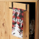 Lantlig buffelkontrollpläd i den röda och svart kökshandduken som presenterar formulera "lyckliga campare" och vitträd.