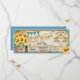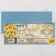 Blått ginghamrutigt mönster med solrosbukett i murskål inslagen med säckväv och spetskant och en tvistsnörebåge rustik lantlig picknick bröllopsinbjudan.