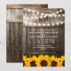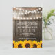 Rustika bröllopsinbjudningar med en lada mörk ekfat bakgrund, gnistrande strängljus, gyllene gula solrosor, din monogram och modern vit text. Hitta andra träförlovningsfest inbjudningar på http://www.zazzle.com/special_stationery.