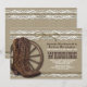 Lantlig Rustika Brudslipsinbjudningar i Linne och Spets - med tryckt band, linne och spets med cowboy boots. Bakom stövlarna finns ett rustikt vagnshjul.