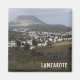 Ett landskap på ön Lanzarote, Kanarieöarna, Spanien. Bergen på bakgrunden och en panoramisk syn på en typisk by med vita hus.