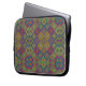 Laptop sleeve featuring a colorful, intricate geometric pattern of diamonds and squares in blue, green, yellow, and pink. The design conveys a vibrant, playful tone.