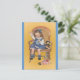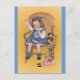 Vintage av en liten flicka sitta i en stor roterande stol med sina dockor, lära sig att syna med skapar dockkläder