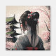 Datorgenerites design einer Geisha. Abbildung einer Frau mit einer hübschen Frisur und Blüten im Haar welche einen Kimono trägt i einem schlichten Design mit leichten Linien. Japanisches Design im AI - Midjourney Stil. Rote Farbornamente verleihen dem Bild das gewisse etwas.